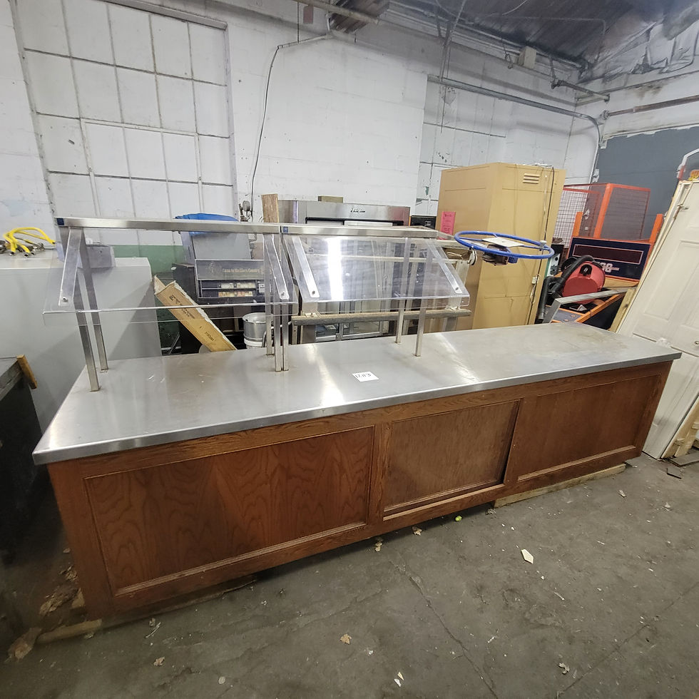 Condition: Used GoodTop Construction: Stainless SteelBottom Construction: WoodSize: 32” x 138” x 36.5” (Table Height)